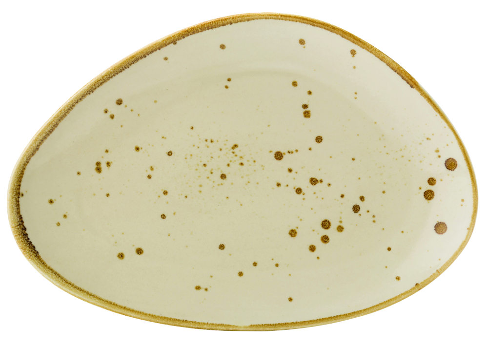 35.5cm cream vitrified porcelain oblong plate with brown speckled finish and painted rim. H:1.3"/3.2cm