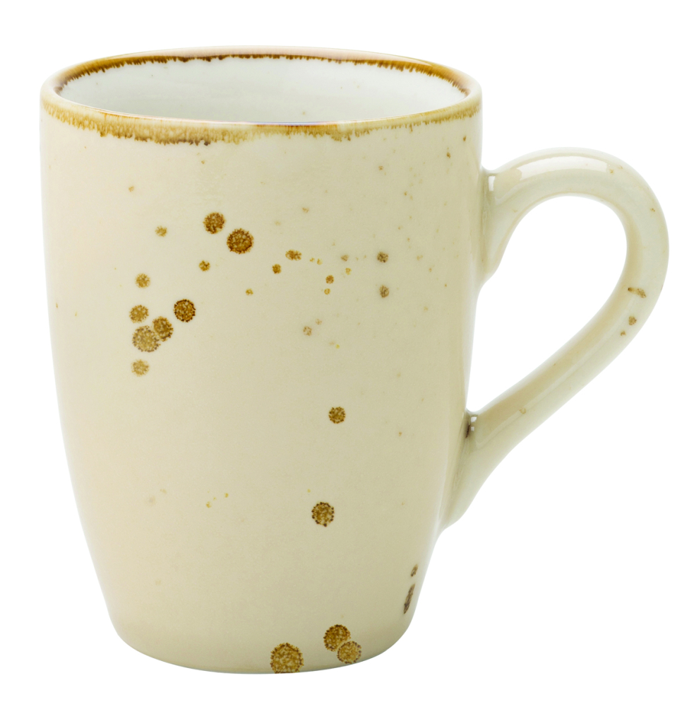 34cl cream vitrified porcelain mug with brown speckled finish and painted rim. 4.7"/12cm H:4.2"/10.6cm