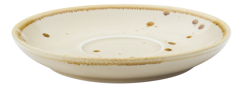 16cm cream vitrified porcelain saucer with brown speckled finish and painted rim. H:1"/2.5cm