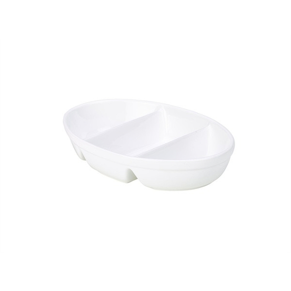 28x19.5cm white fully vitrified porcelain oval dish with 3 divided sections. H:2"/5cm