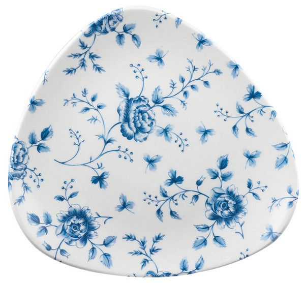 22.9cm white super vitrified porcelain triangular plate with blue floral print.