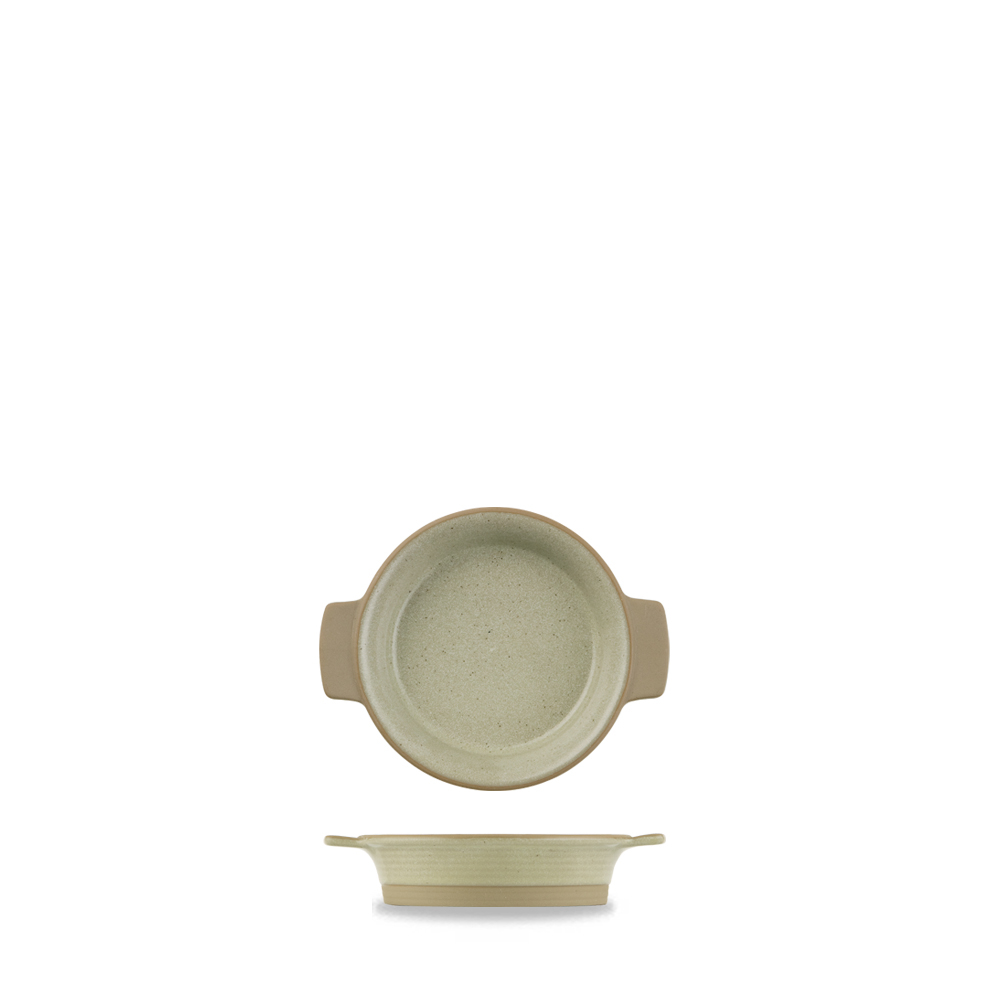 19cl beige stoneware with speckled glaze round individual dish. 4.7"/12cm