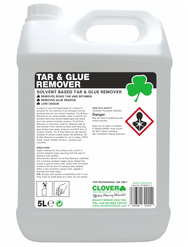 For the removal of tar and glue from all surfaces that are not solvent sensitive. A ready-to-use thin liquid based on a blend of solvents. Tar and Glue Remover is not water soluble. Ideal to remove tar, bitumen and most solvent-based flue and stains from any solvent resistant surface, Tar and Glue Remover is commonly used for cleaning road tar from vehicle surfaces.