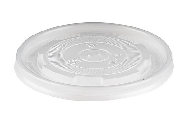 Plastic Lid for 12oz and 16oz Soup Containers. Plastic soup container lids are made from white polypropylene. This material has a high temperature tolerance, therefore the lids are suitable for use with hot foods. Lids fit the corresponding round paper food containers securely, hence protecting food and aiding safe transportation. Plastic lids are not compostable, but can be recycled. Compatible with Leaf 2 12oz Food Container (FC12LEAF)