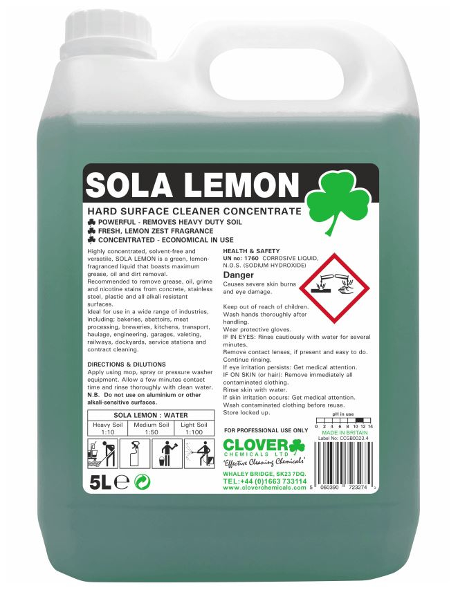 A highly concentrated, versatile cleaner, Sola Lemon boasts maximum grease and dirt removal. A green liquid for the removal of industrial grime and dirt, Sola Lemon contains a lemon perfume to leave a fresh fragrance after use. Recommended to remove grease, oil, grime and nicotine stains from concrete, stainless steel, plastic and all alkaline resistant surfaces.