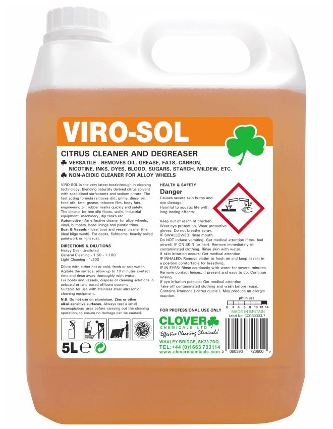A blend of naturally derived citrus solvents, Viro-Sol is fast-acting to remove even the most stubborn soiling with ease.