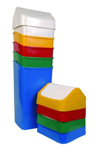 One of a range of modern designed bins in the four hygiene colours and white with a swing top.